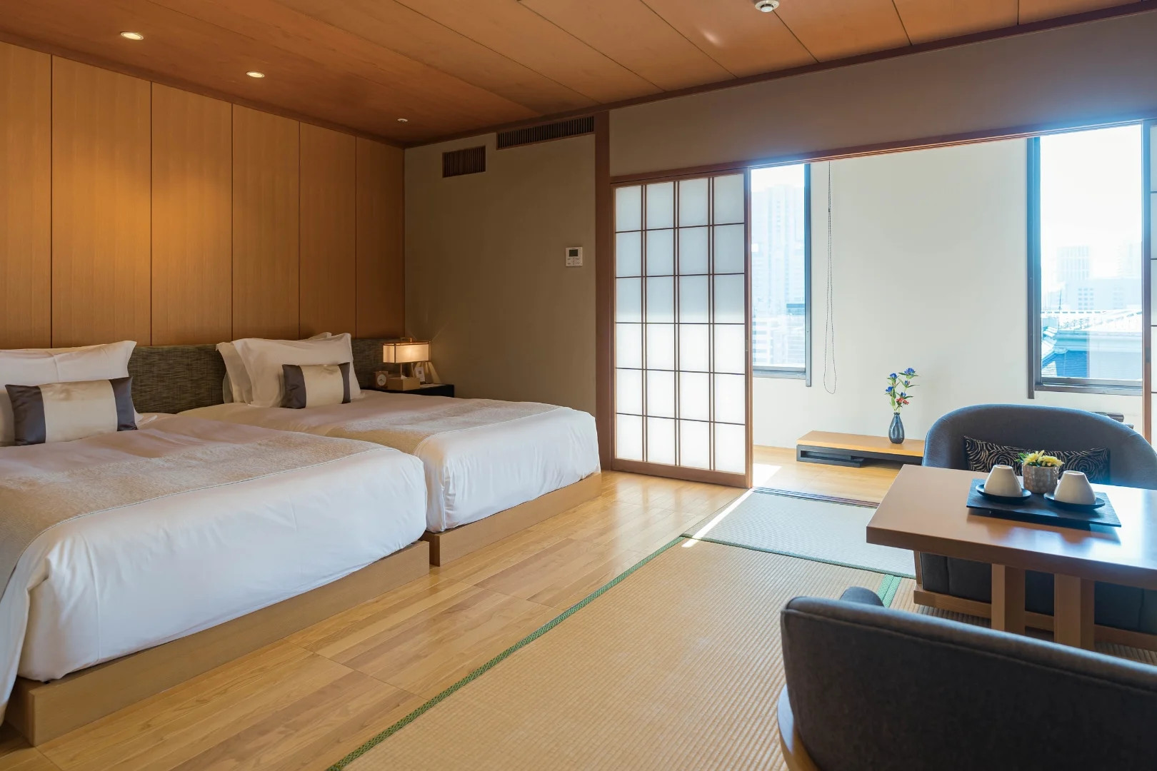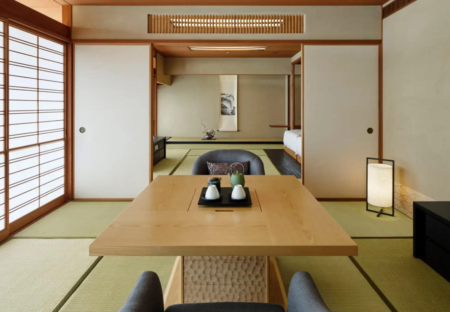 De låga futonsängarna är mjuka och bekväma, men bäddas på höjd som i västerländska rum. Fönstren vetter mot trädgården, och när ljuset filtreras genom pappersskärmarna får rummen ett mjukt, nästan silkeslent sken.