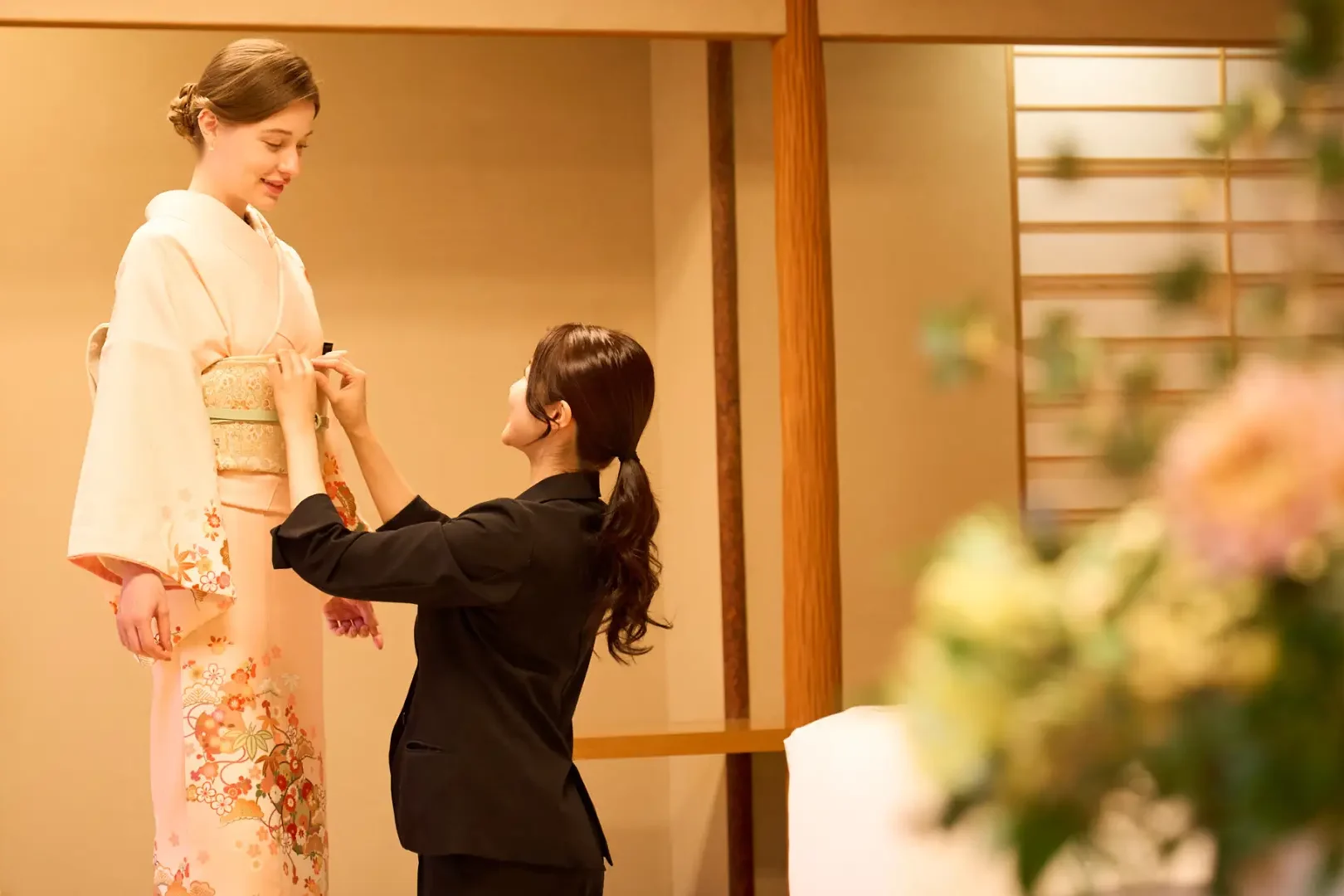 Hotellets sexton sviter är alla uppkallade efter blommor som växer i trädgården – och under körsbärsblomningen bär personalen kimono i matchande färgtoner för att spegla säsongens nyanser.